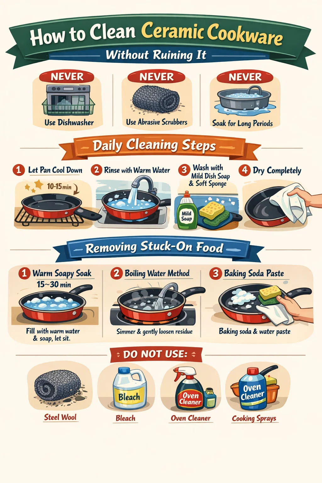 Le pentole in ceramica devono essere pulite con acqua tiepida, qualche goccia di detersivo per i piatti e una spugna o un panno morbido, subito dopo che si sono raffreddate. Non metterlo mai in lavastoviglie, non usare mai spugne abrasive e non lasciarlo mai in ammollo per periodi prolungati. Queste tre regole da sole prolungheranno significativamente la vita delle tue pentole in ceramica antiaderenti.