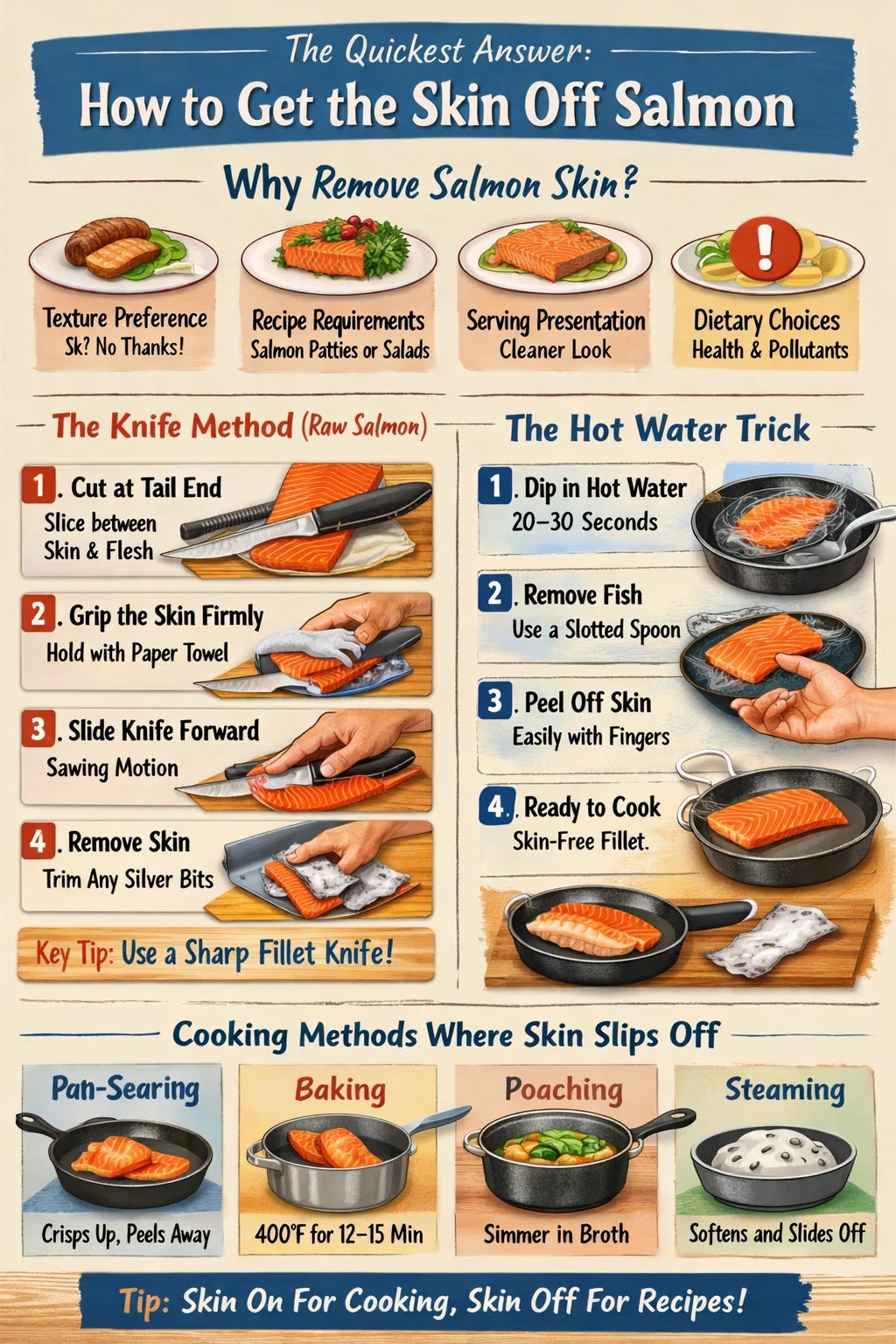 Per la maggior parte dei metodi di cottura, rimuovere la pelle dopo la cottura è più semplice. Il calore rompe il tessuto connettivo tra pelle e carne, rendendo la separazione senza sforzo. L'eccezione è quando è necessario il pesce senza pelle per una ricetta prima della cottura, ad esempio per hamburger di salmone, preparazioni per sushi o marinate in cui è importante il contatto completo con la superficie.
