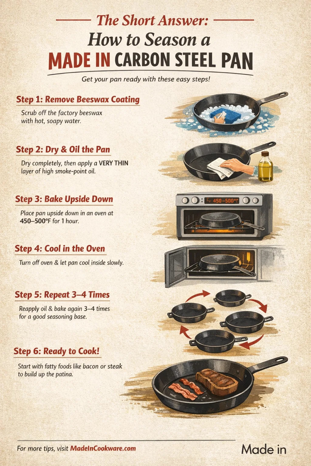 Per condire una padella in acciaio al carbonio Fatto a, lavi via il rivestimento protettivo di cera d'api con cui viene fornita, la asciughi completamente, applichi uno strato molto sottile di olio con punto di fumo elevato su tutta la superficie e lo riscaldi in un forno a 450–500 ° F finché l'olio non polimerizza in uno strato duro e liscio. Ripeti quel processo 3 o 4 volte prima del tuo primo cuoco. Questo è il nocciolo della questione. Tutto il resto – gli oli specifici, le sfumature della temperatura del forno, il metodo del piano cottura, la cura a lungo termine – è solo un perfezionamento in aggiunta a quella struttura di base.