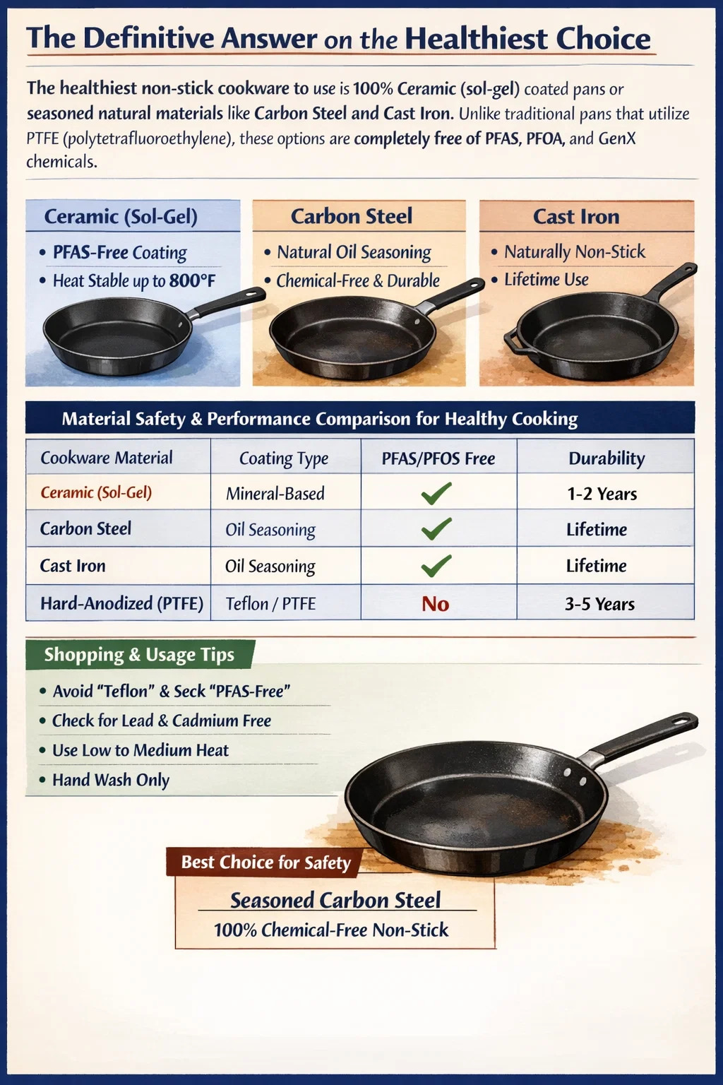 Il più sano pentole antiaderenti usare è Pentole rivestite al 100% in ceramica (sol-gel) o materiali naturali stagionati come acciaio al carbonio e ghisa . A differenza delle pentole tradizionali che utilizzano PTFE (politetrafluoroetilene), queste opzioni sono completamente prive di sostanze chimiche PFAS, PFOA e GenX. Per coloro che cercano il profilo più sicuro in assoluto con zero rischi chimici anche a temperature torride, Acciaio al carbonio stagionato si distingue come la prima scelta perché crea una barriera fisica antiaderente utilizzando solo calore e olio vegetale polimerizzato.