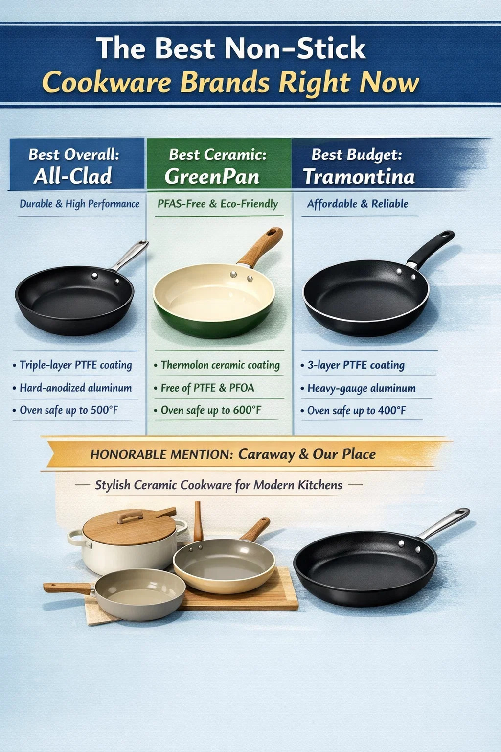 | GreenPan | Ceramicaaa (Termolon) | $ 40– $ 120 | Fino a 600°F | Seleziona i modelli | Cuochi ecosostenibili e senza PFAS |
